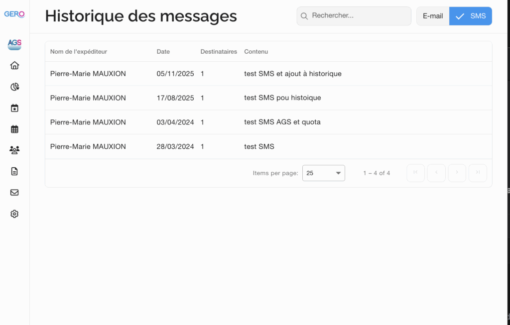 Le module Messages de GERO permet aux responsables d’organisation d’envoyer des SMS ou e-mails à leurs membres, de suivre les crédits disponibles, et de consulter l’historique des envois.