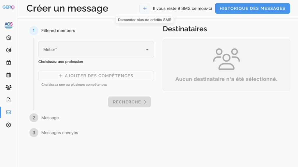• Le bouton ➕ “Demander plus de crédits SMS” (envoi automatique d’une demande à un administrateur AGS)